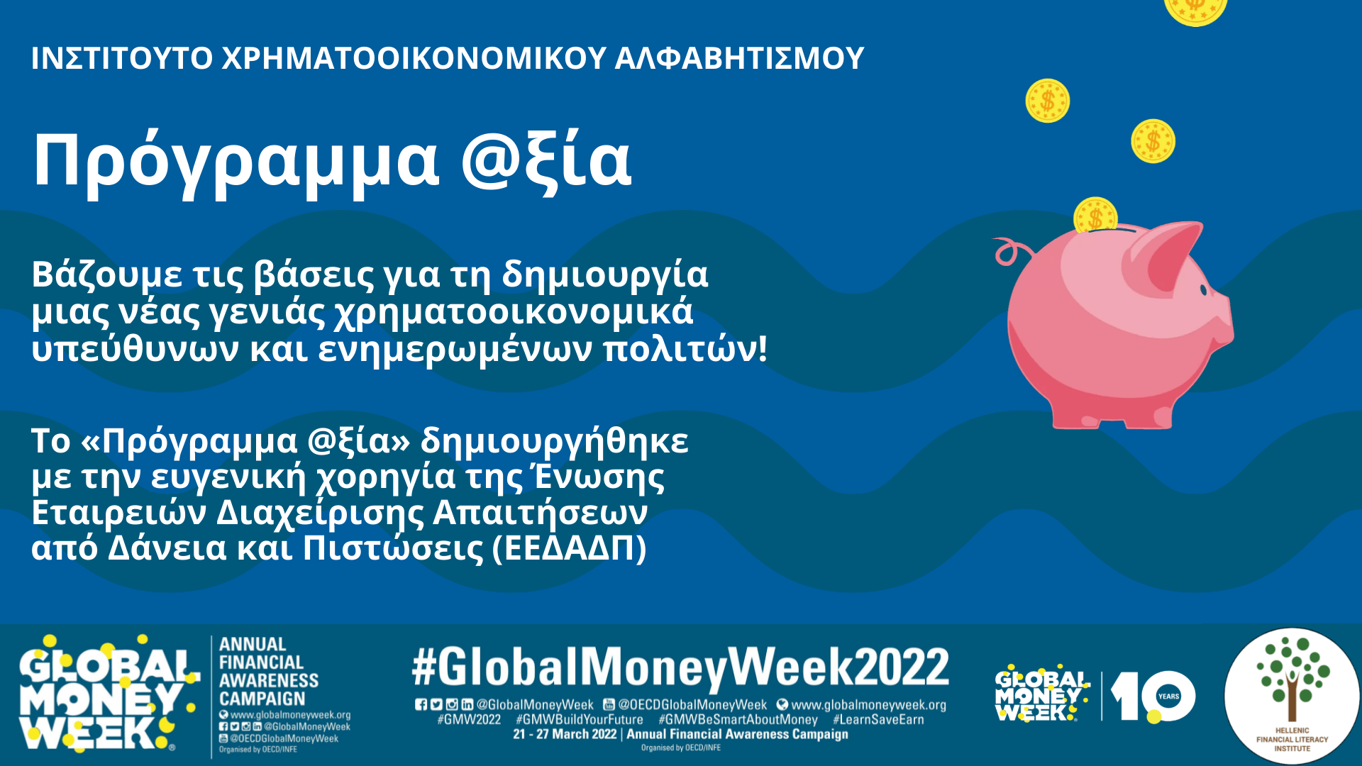 Ακολουθήστε μας κατά την εβδομάδα 21-27 Μαρτίου 2022, για να γιορτάσουμε μαζί την Global Money Week 2022! Το Ινστιτούτο Χρηματοοικονομικού Αλφαβητισμού θα διοργανώσει διάφορες εκδηλώσεις και θα προσφέρει πολύτιμο εκπαιδευτικό υλικό για την ελληνική συμμετοχή στην φετινή εκστρατεία. Μείνετε συντονισμένοι στην ιστοσελίδα μας και στις πλατφόρμες μέσων κοινωνικής δικτύωσης για να μάθετε περισσότερα!
